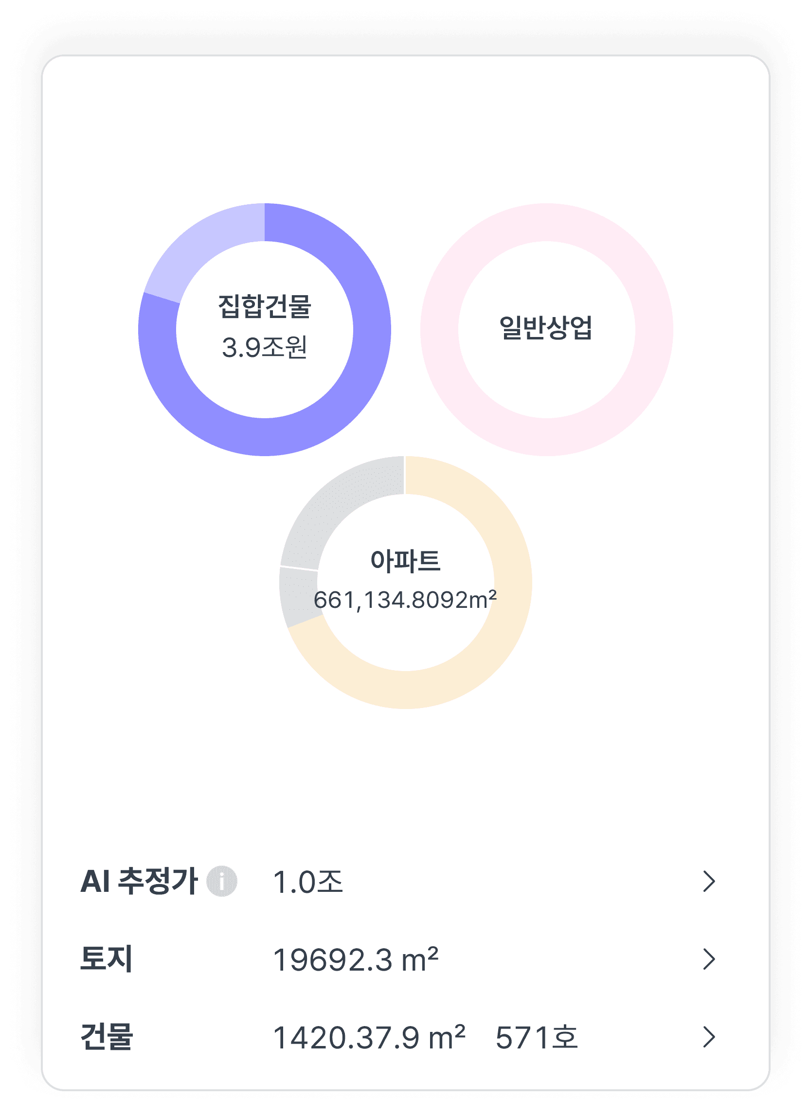 아파트, 연립다세대, 오피스텔, 단독·다가구 주택뿐 아니라 상가, 공장, 숙박시설, 지식산업센터, 업무용 건물, 토지 등 모든 집합건물과 토지를 포괄합니다. 현재 국민은행, 삼성증권, MSCI, 케이뱅크, 토스뱅크, 신협, 산림조합 등 다양한 금융기관에서 이 AVM을 활용하고 있으며, 전국의 모든 부동산에 대해 AI 추정가를 데이터 또는 API 형태로 제공합니다.